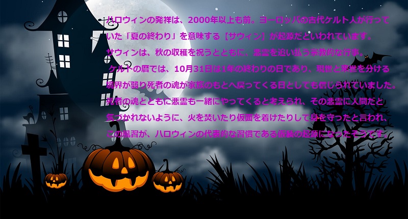 ハロウィンの発祥は、2000年以上も前。 ヨーロッパの古代ケルト人が行っ いた「夏の終わり」 を意味する 【サウィン】 が起源だといわれています。
