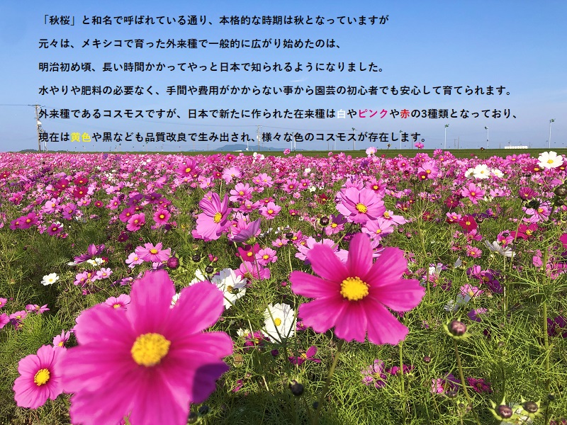 水やりや肥料の必要なく、 手間や費用がかからない事から園芸の初心者でも安心して育てられます。 「外来種であるコスモスですが、 日本で新たに作られた在来種は白やピンクや赤の3種類となっており、 現在は黄色や黒なども品質改良で生み出され、様々な色のコスモスが存在します。