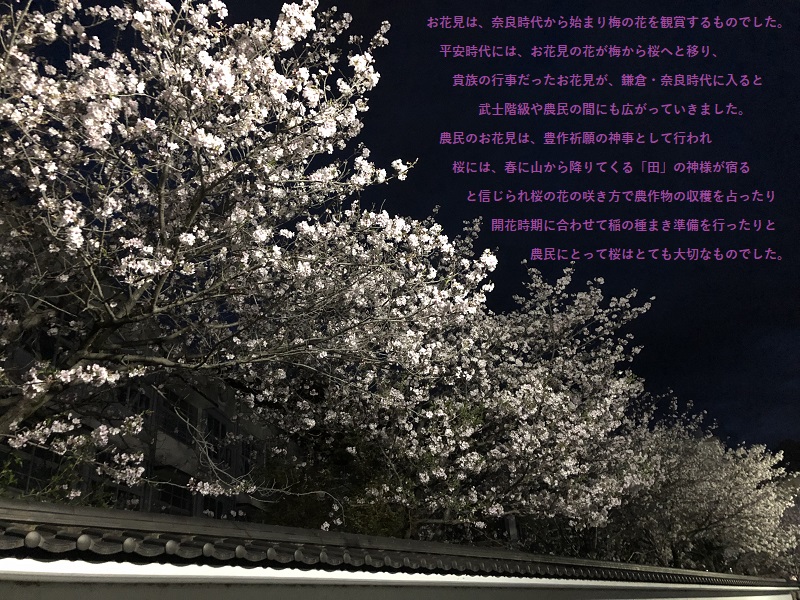 桜には、春に山から降りてくる 「田」 の神様が宿る と信じられ桜の花の咲き方で農作物の収穫を占ったり 開花時期に合わせて稲の種まき準備を行ったりと